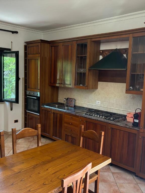 La cucina è completamente attrezzata con frigorifero, utensili, macchina da caffè e tutto il necessario per preparare colazioni, pranzi o cene in totale autonomia.